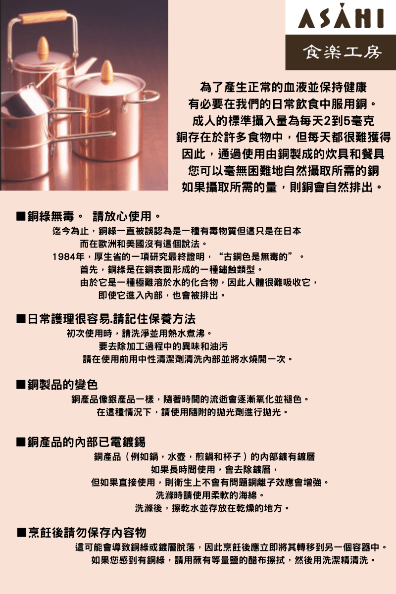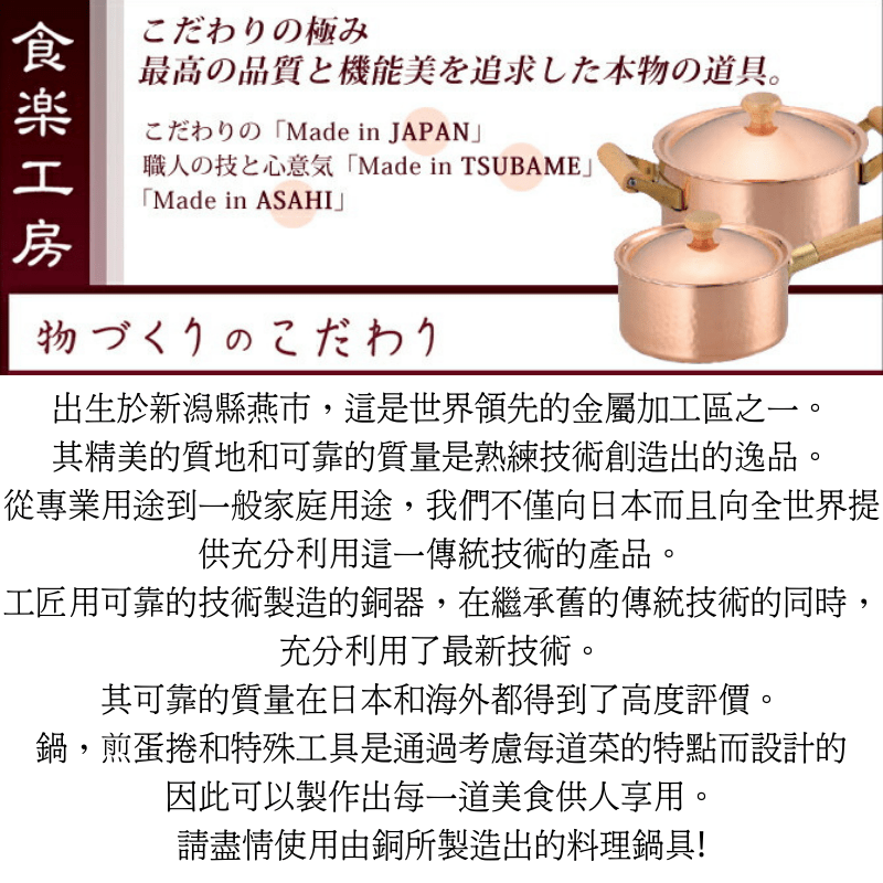 | 產品特色 | 銅具有出色的導熱性和保溫性,因此在烹飪時,中等熱量或更低的熱量就足夠了。 銅炊具非常經濟,因為它可以節省能源,並且無需適當的護理即可長期使用。 |