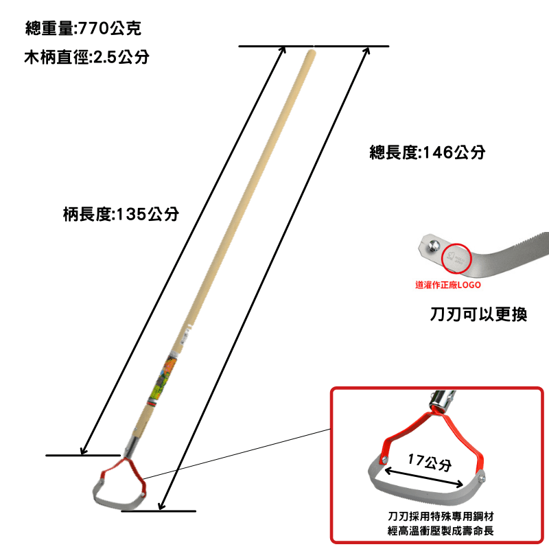 | 產品規格 | 產品規格: 總長度:146公分 總重量:770公克 刀幅寬:17公分 木柄長:135公分 木柄直徑:2.5公分 產地 日本 |