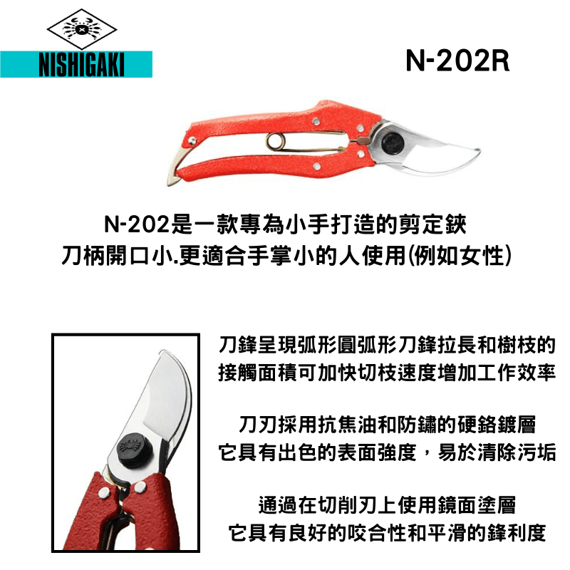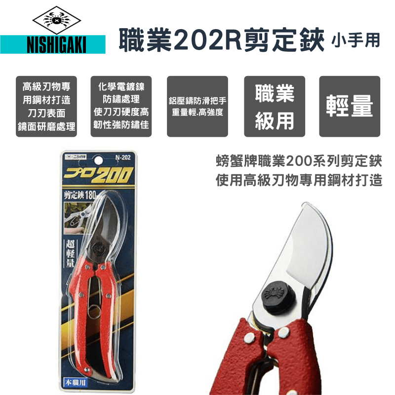 | 產品規格 | 產品編號 N-202R 產品名稱 職業200剪定鋏180(小手用) 全長 180mm 刀刃長度 50mm 重量 約145g |