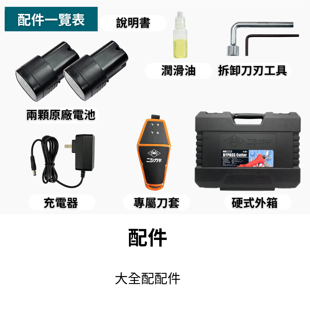 | 產品規格 | 產品名稱 剪定剪刀 產品編號 N-981 本體尺寸(毫米) 295×100×60(僅本體) 重量 約710公克(僅機身) 馬達額定電壓 直流16.8V 馬達額定功耗 100W 切割速度 約 0.6 秒/1 個週期 電池重量 235克 充電時間 約 3 小時 *根據使用情況和電池狀況而變化。 配件 電池(2 塊)、充電器、潤滑劑、套筒扳手、六角扳手、剪刀盒、硬盒 |