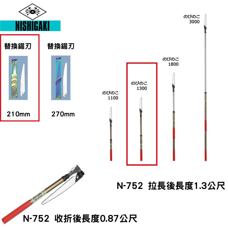 | 產品規格 | 產品編號 N-752 產品名稱 折合式伸縮鋸1300 全長 0.87-1.3M 葉片長度 210mm 重量 約470g 產地:日本 |