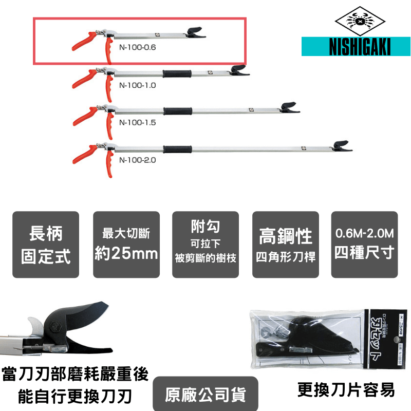 | 產品規格 | 型號:N-100-0.6 品名:固定式 長修枝鋏 0.6M 全長 0.6m 刃長 65mm 重量 約510g 產地:日本 |