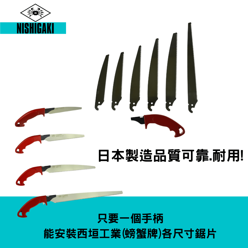 | 產品特色 | 原廠公司貨 日本製,品質好,耐用度高 西垣手鋸柄(岡田Z牌手鋸片可共用) 可購買一個手柄,搭配多種尺寸的鋸片 |