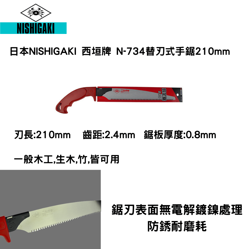 | 產品規格 | 品名:NISHIGAKI 西垣工業 螃蟹牌 N-734替刃式手鋸210mm 刃長:210mm 齒距:2.4mm 鋸板厚度:0.8mm 一般木工,生木,竹,皆可用 重量:108g 產地:日本 |