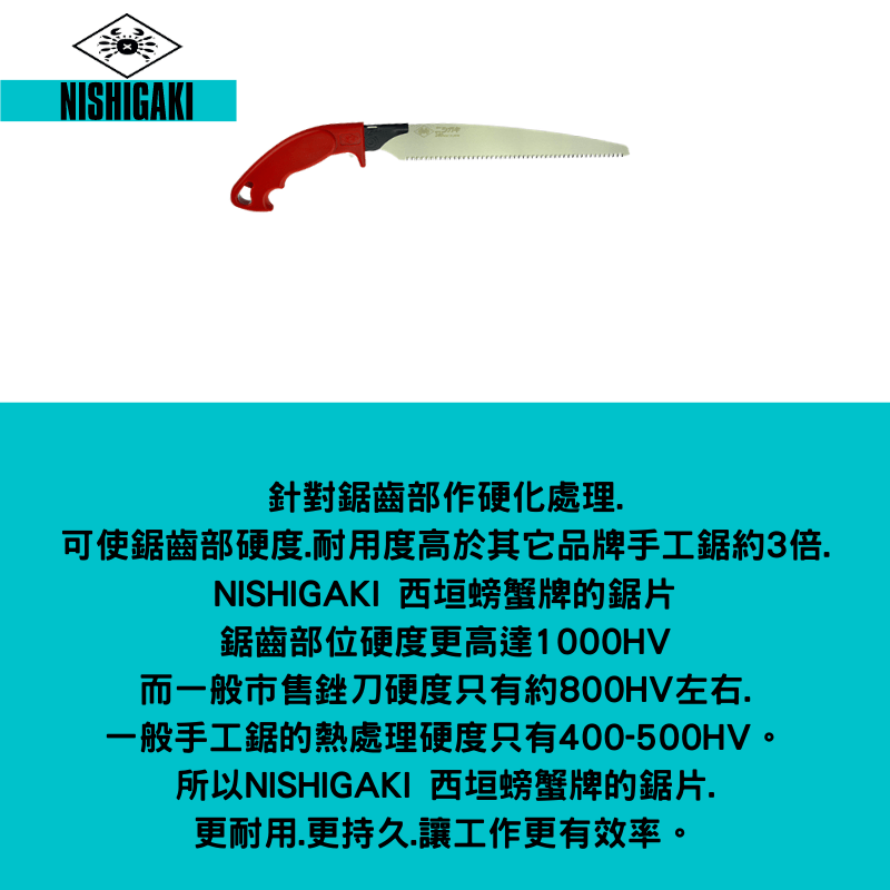 | 產品特色 | 針對鋸齒部作硬化處理.可使鋸齒部硬度. 耐用度高於其它品牌手工鋸約3倍. 鋸片更換容易.無需用到工具 |