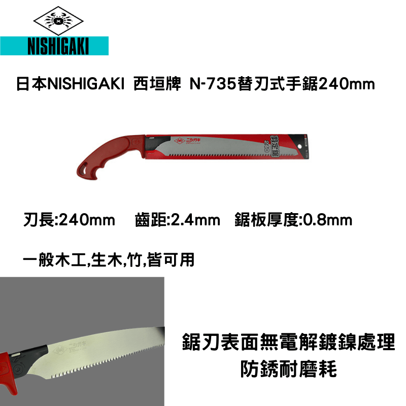 | 產品規格 | 品名:NISHIGAKI 西垣工業 螃蟹牌 N-735替刃式手鋸240mm 刃長:270mm 齒距:2.4mm 鋸板厚度:0.8mm 一般木工,生木,竹,皆可用 重量:115g 產地:日本 |