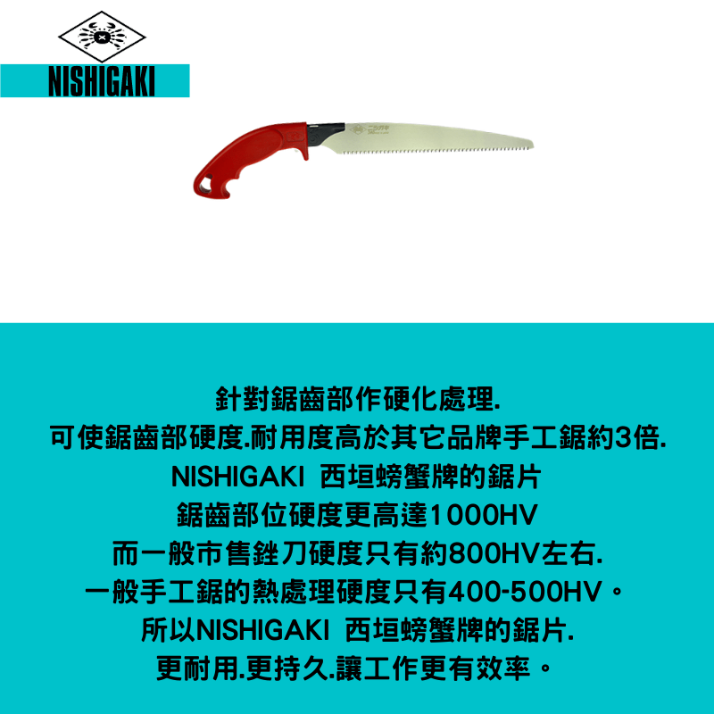 | 產品特色 | 針對鋸齒部作硬化處理.可使鋸齒部硬度. 耐用度高於其它品牌手工鋸約3倍. 鋸片更換容易.無需用到工具 |