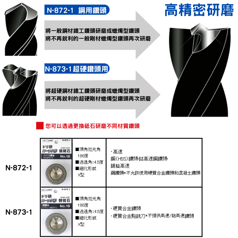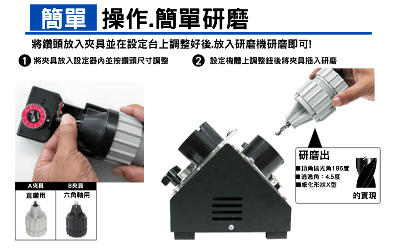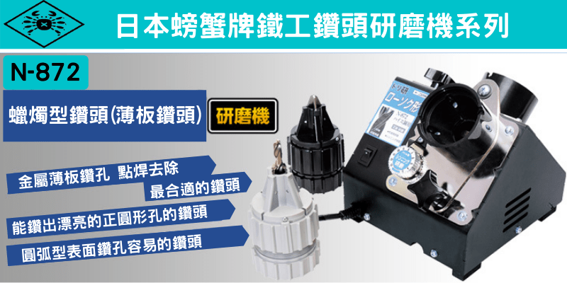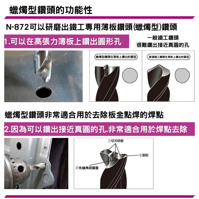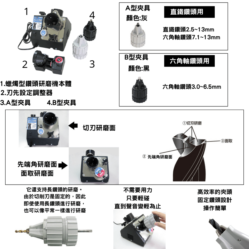 | 產品特色 | 可以將普通鐵工用鑽頭研磨成蠟燭型鑽頭 也可以將鈍化的蠟燭型鑽頭銳化 蠟燭型鑽頭最適合用於高張力薄板鑽孔 也適合去除板金上點焊的焊點 弧形表面上的鑽孔 可以透過更換不同型號的砥石 研磨不同材質的鑽頭 |