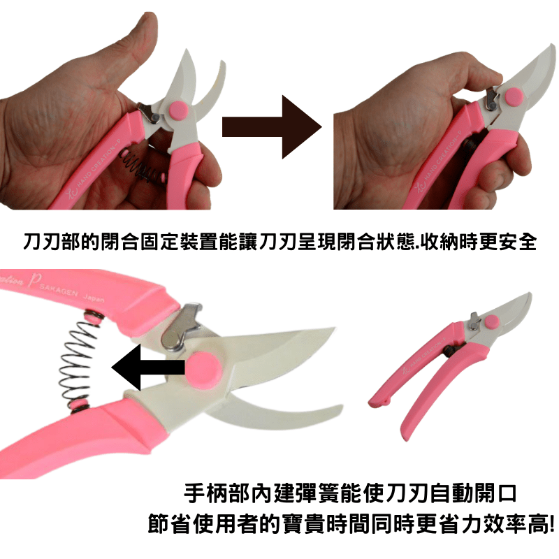 | 產品特色 | 美麗輕巧,重量輕適合職業工作者 刀刃部鐵氟龍樹脂塗料加工!!不易生鏽 包覆觸感佳的塑膠手柄質感與實用兼具 手柄部內建彈簧能使刀刃自動開口 節省使用者的寶貴時間同時更省力效率高 |