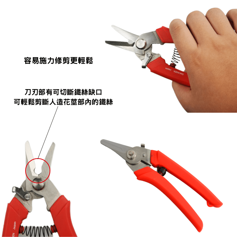 | 產品規格 | 品名:坂源人造花剪(鐵絲能剪斷) 刀刃部採用高碳素鋼材打造 化電鍍學鎳處理.防鏽能力佳! 更長的手柄使用上更省力 容易施力修剪更輕鬆 產地 日本 |