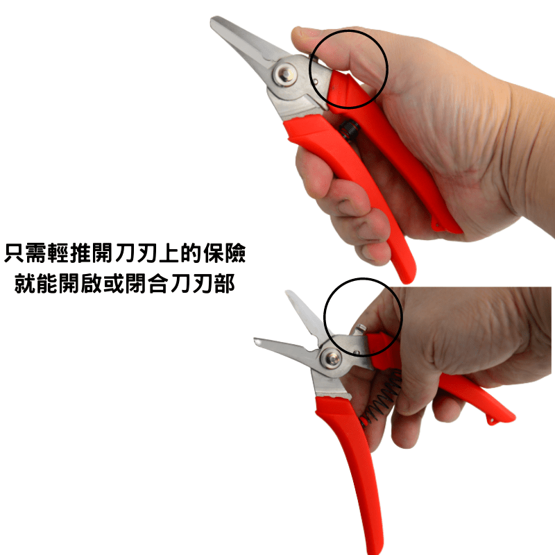 | 產品特色 | 只需輕推開刀刃上的保險 就能開啟或閉合刀刃部 刀刃部有可切斷鐵絲缺口 可輕鬆剪斷人造花莖部內的鐵絲 |
