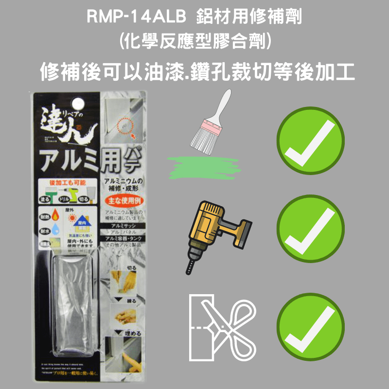| 產品規格 | 品名:高森補土鋁材用修補劑(化學反應型膠合劑) 型號:RMP-14ALB 種 類:化學反應型膠合劑 成 分:熱硬化性樹脂.顏料.填充劑 重 量:約38克 耐 熱 溫:-40~260度 |