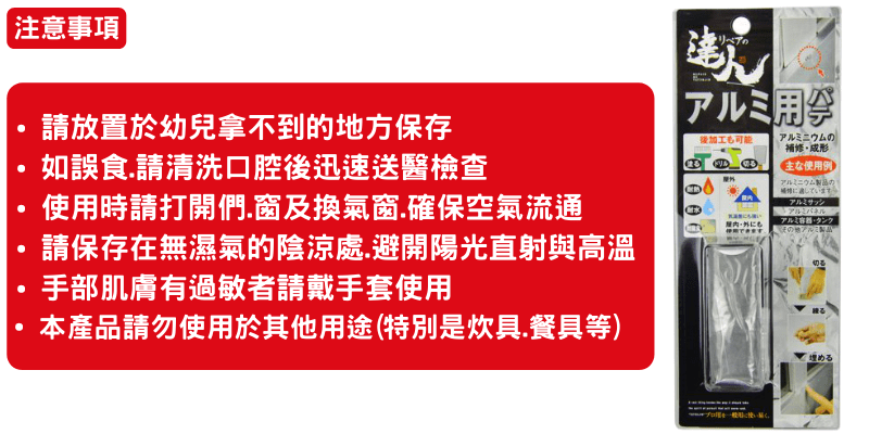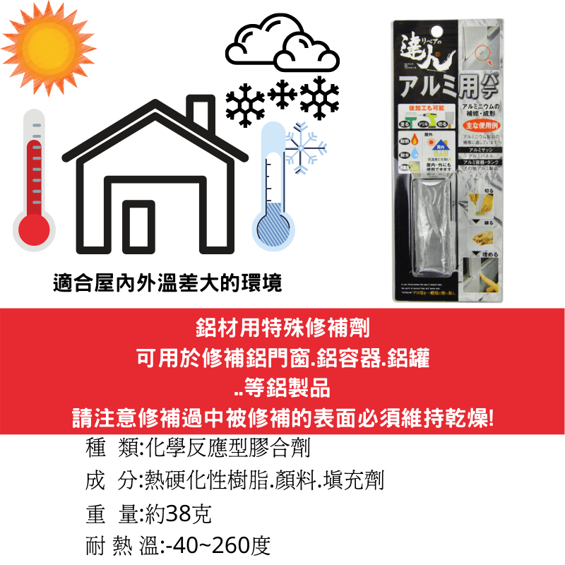 | 產品特色 | *熱硬化性樹脂系的鋁材用修補劑.也可用於玻璃.石材與其他金屬的修補 *耐熱性.耐水性.耐腐蝕性強.室內室外都可以使用 *硬化後可以進行.油漆.鑽孔裁切等後製加工 *初期硬化時間約5~7分鐘.完全硬化時間約24小時 (硬化時間依季節會略有差異)本產品為補強修補材料 並非構造本身的修補材料 |