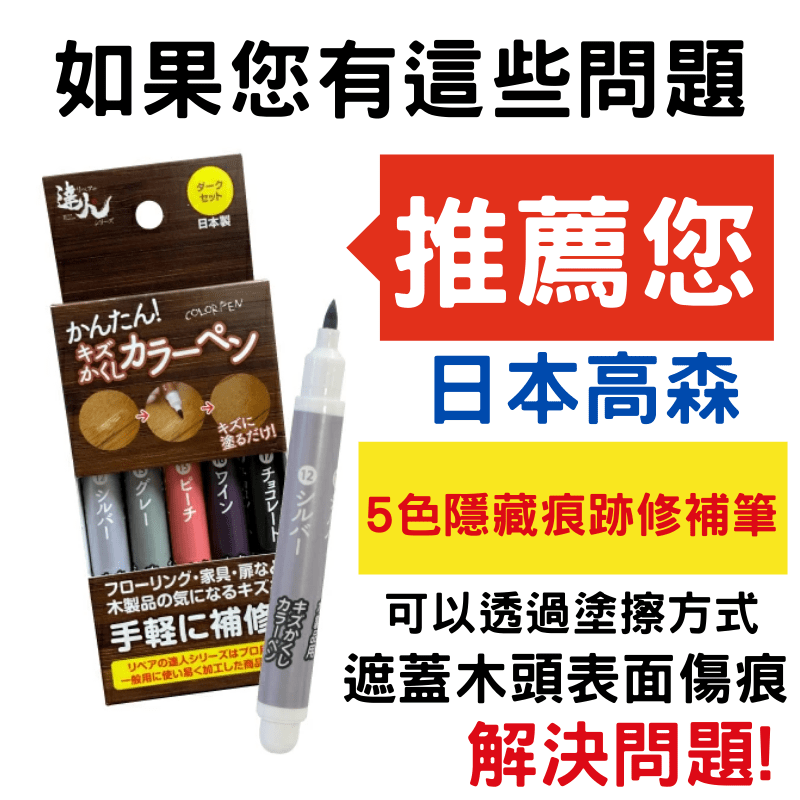 | 產品規格 | 日本高森隱藏刮痕的彩色修補筆 (5色一組)RPN-32 品名:木製品傷痕修補筆 型號:RPN-32 屬於深色系顏色如下: (12.銀色13.灰色15.桃紅色16.酒紅色17.巧克力色) 成分:顏料,乙醇,表面活性劑 產地:日本 |
