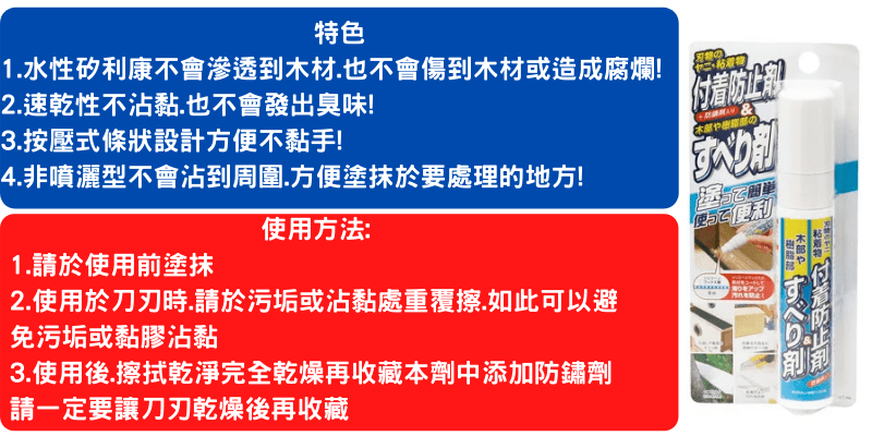 | 產品特色 | 易於使用的鬥桿類型,可改善門檻和抽屜的滑動! 木質表面不會被污染,也不會損壞。 |