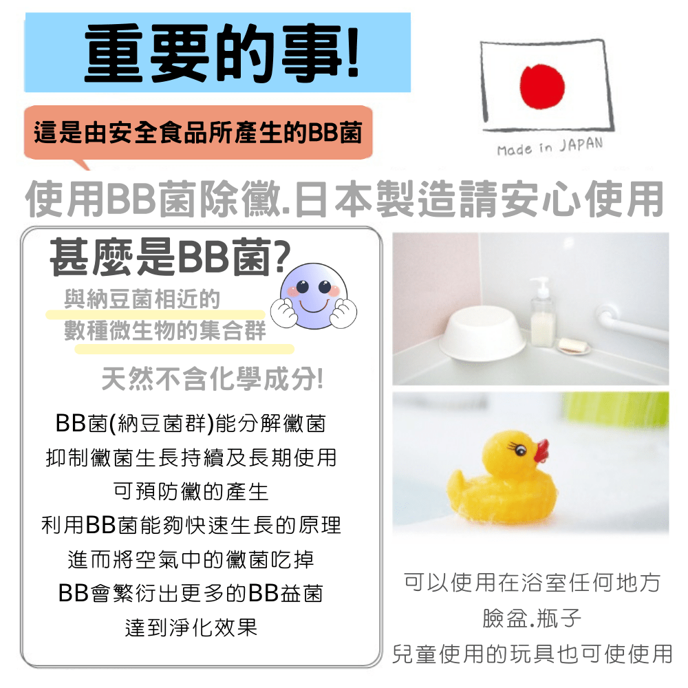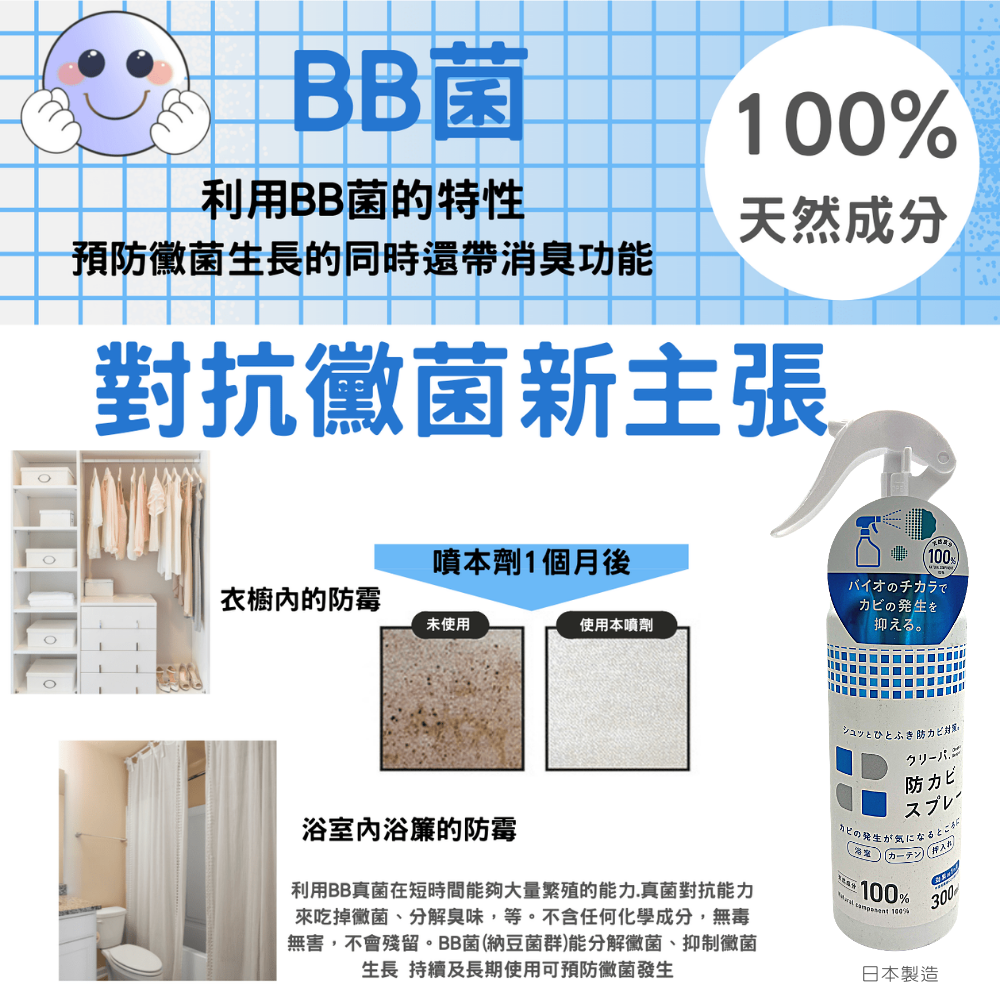 | 產品特色 | ( BB菌) 100%天然成分! 搖勻後 隨意噴在易發霉或有霉味的地方 噴灑一次有效期約一個月(潮濕處也可每週一次) 浴室,浴簾,衣櫃,鞋櫃.任何容易生長黴菌的地方 |
