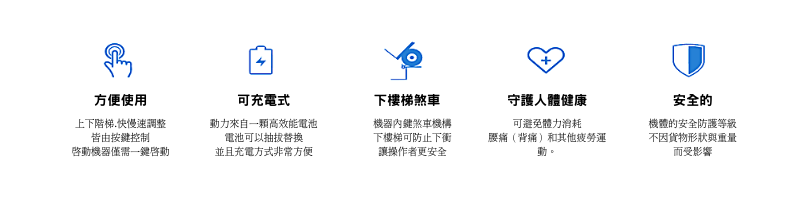 | 產品特色 | 手柄:旋轉操作,可折疊,調節角度和高度 運行按鈕:點觸式操作按鈕,操作簡便,確保安全 電池:快速插拔設計,自動上電,獨立開關,顯示電池容量和電壓 快/慢按鈕:改變速度 上樓/下樓按鈕:選擇上/下模式 馬達蓋板:密封整個執行機構,IP54,防水,防塵 支撐輪:採用聚氨酯材料的高耐磨防滑支撐輪 剎車系統:自動剎車,防止滑動,下樓時確保正確位置 裝載板:可折疊,節省空間 |