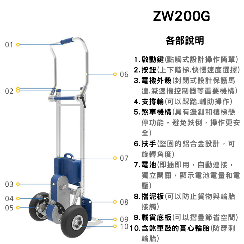 | 產品規格 | 型 號:ZW200G 淨 重:29公斤 電池重量:3公斤 額定載重:200公斤 最大載重:210公斤(保險絲有可能燒毀) 電池容量:大約爬階梯1200-1800階梯 爬梯速度:17階梯/分鐘(慢速) 34階梯/分鐘(快速) 車體材料:高強度鋁合金 摺疊位置:扶手 煞 車:有煞車 輪胎尺寸:10英寸 階梯高度:21公分 電池類型:鋰電池 工作電壓:48V 充電時間:3小時 充電電壓:110V-230V 噪 音 值:小於70分貝 防護等級:IP54 整體尺寸:車 高:159公分 車 寬:54.5公分 最小厚度:29.8公分 摺疊尺寸:車 高:120公分 車 寬:54.5公分 最小厚度:29.8公分 |
