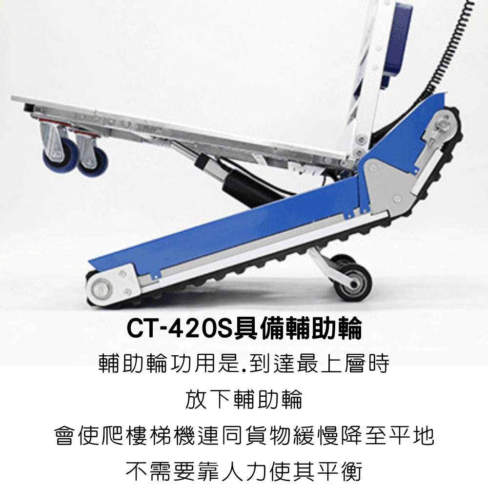 | 產品規格 | 產品型號:CT420S 機身尺寸:手把高度 最低:115cm 最高:164cm 車身寬度:61.4cm 車身長度:117cm 產品重量:98kg 最大裝載量:420kg 電池容量:1400~1600階梯(約78-100層樓) 電池重量:3.1kg 樓上速度(滿載):10 階/分鐘(低速),13 階/分鐘(高速) 樓下速度(滿載):13 階/分鐘,16 階/分鐘 最小平台尺寸:1500X1500mm(樓梯轉角) 噪音量:<70dB 防護等級:IP54 樓梯要求:階梯高度<21cm |