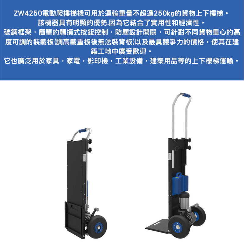 | 產品規格 | 型號:ZW4250 車架材質:碳素鋼 載重:250公斤 爬升速度:35階梯/分鐘(最快) 淨重:32公斤 電池容量:38-84層 電池類型:鋰電池 電池重量:3公斤 充電時間:3小時 充電電壓:100V至240V 台階高度:≤210mm 煞車:沒有 噪音等級:<85dB 保護等級:IP33 折疊尺寸:1190 * 530 * 320mm 整體尺寸:1720 * 530 * 620mm |