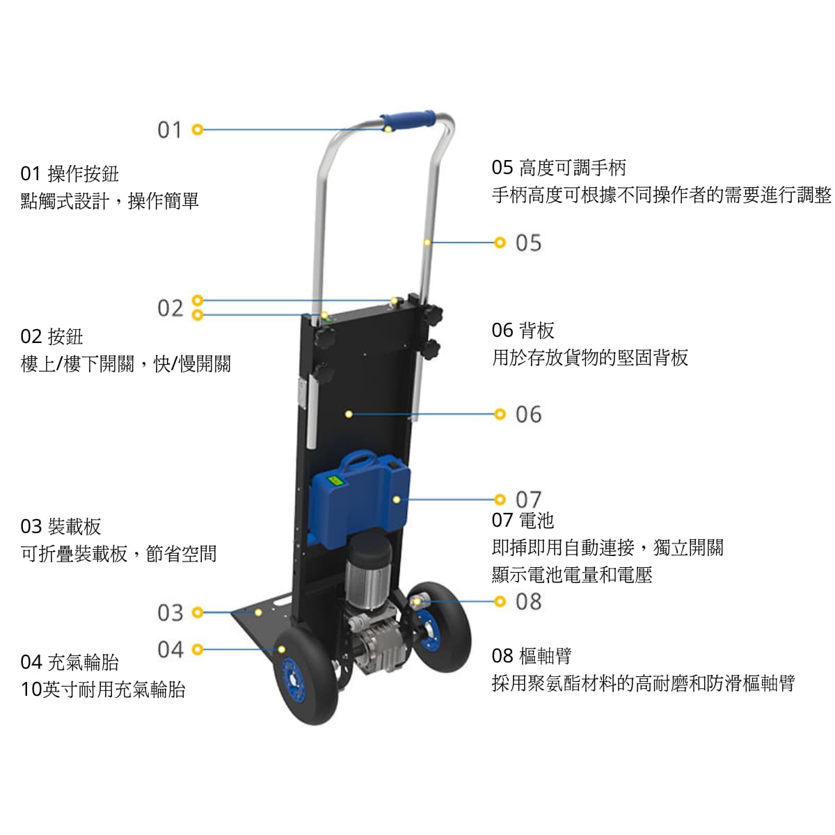 | 產品特色 | 手柄:伸縮式設計,高度可調,2個角度可選 運行按鈕:點觸式操作按鈕,操作簡便,確保安全 電池:快速插拔設計,自動上電,獨立開關,顯示電池容量和電壓 速度控制按鈕:按鍵選擇速度 上樓/下樓按鈕:選擇上/下模式 支撐輪:採用聚氨酯材料的高耐磨防滑支撐輪 載重板:3種載重板安裝方式,以適應更多重心不同的貨物 大功率無刷馬達:功率強勁,最大承重:250kg 背板:更好地支撐貨物 開關:防塵設計 |